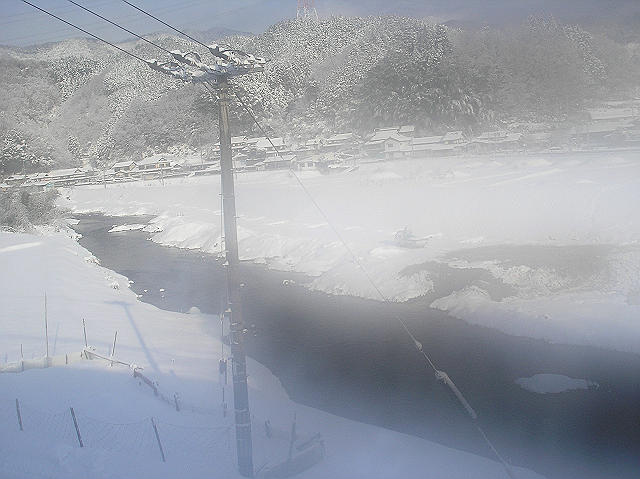 こんばんは。今日は3連休明けの25日。週末の22日が大雪でお客さんが少ないことも手伝い・・・。今日はみんな残業でした。今日も旅の続き。★福知山→豊岡★ 福知山駅に4分遅れで到着した「こころのたび」。ここは最近駅の効果が完成したところ。本来なら次回のために駅構内を散歩するのですが乗り換え時間が少ないのですぐに豊岡行きの列車に乗り込む。今度は1時間強。座ろうと思えば座ることができたものの、景色を見たいので立つ事に。もちろん陣取ったのは先頭車両の進行方向右側。そう、この区間は右側の方が景色がいいのです。 列車は4分遅れて出発しました。いきなり次の上川口駅で行き違いのため停車。すぐに来るかと思えば、なかなか来ない結局ここで17分遅れとなる。この遅れは取り返せないと判断し、すべて記録につけようと思う。そう、このときにAさんと知り合う。Aさんは京都からやってきたのです。日程を聞くと「こころのたび」と同じ。時々話しながら旅が続きます・・・。 さてこの区間も景色がいいので写真を何枚か撮りました・・・。 下夜久野駅付近で撮りました。 上夜久野駅-梁瀬駅付近の車窓このあたりまでは天気が良かったですが・・・ここからはタイトルが示すような感じになってきました・・・。八鹿駅付近の車窓・・・雪が斜めに降っています(分かりにくいかも) 車窓を見て今日は玄武洞は無理だあなあ(進行方向右側に見えるのですが)と思いました。 列車のほうは遅れは取り戻せないのは分かっていたものの次の豊岡駅での乗換を時刻表で確認しました。時間的には接続には微妙なのですが・・・・。この区間は1時間に1本なので多分大丈夫。無理ならまたそのとき考えようとのんきに考えまてした。 とか思ううちに豊岡駅に到着。★豊岡駅→浜坂駅★ 今度も遅れるに違いないと思いながら、列車に乗り込む。多分まだ乗り換え列車は着ていないと思っていたが到着していました(ウレシイ。寒い中ホームで待たなくてすんだ)ここでも少し時間が会ったので車内から駅を写真に・・・。雪が強くなってきているのが分かるかと思います。線路も隠れそうです。さて列車は行き違い等もあり25分遅れで豊岡駅を出発しました。 予想通りというか次の玄武洞では雪のため写真が撮れませんでした。27分というのは「次の浜坂でまずいなあ」とAさんと話をする。 車内は混んでいたものの城崎温泉駅大半の乗客が降りる。この先は去年の夏以来通るところ。竹野を過ぎる頃から日本海が姿を見せ始める。「こころのたび」も早速車窓を楽しみました。 真ん中あたりに見えるのが日本海です。中央の駅名板にも着目。この高さまで雪があります。佐津・香住と漁港町を過ぎて餘部鉄橋です。 山側も取りたかったのですが無理でした・・・。 餘部鉄橋を餘部駅停車中の列車の最後尾から撮影・・。橋が白いじゅうたんのようです・・・。 そうこうしていると浜坂駅に列車は差し掛かりました。浜坂駅で何が起きたかは次回に。。。、 今日はここまで。 皆様からの御意見・御感想をお待ちしています。