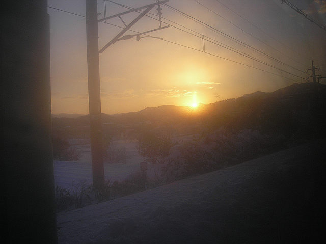 こんばんは。今日は久々に家に1日。しかも天気がよくぽかぽかでした。旅の疲れもほぼなくなり、今日はデジカメで撮った写真をPCに転送しました。今日から道中記となります。★前日★ 行く前日の夕方までは何も決めていませんでした。仕事後いつものお好み焼き屋さんに・・・。旅スキ夫婦と楽しい時間を過ごしました。明日はお出かけと「こころのたび」。そしたら、「南にいくのは?」と。頭の片隅に入れたまま帰宅。PCでリンク先などを見ているといまじさんのHPで、砂丘・ラクダ・・・。なんか行ってみようという気になり決定(砂丘は前に行ったことがありますが)★出発進行 宝塚→福知山★ 寝付いたのは2時過ぎ。起きたのは4時45分。目覚ましで一発で起きる。身支度を済まし。朝食を食べながら気象庁のHPをチェック。山陰は雨or雪。冬だし・・・と思う。食後荷造り開始。といっても時刻表・ボールペン・ペットボトル・バスタオルぐらいなのであっという間。 近所のコンビニエンスストアでパンを買って出発。 「こころのたび」の家は阪急沿線なので福知山線を利用するときは宝塚からのことが多い。今回も阪急で宝塚に行きJR宝塚駅で始発の福知山行きを待つ。寒いので待合室で待つものの人の出入りが結構ありなかなか暖まらない。列車到着10分ほど前になり外で待つことにする。ホームの端を見ると2・3センチ雪が残っています。今日は1日雪とのお付き合いになるなあと思う。 福知山行き始発に「こころのたび」は乗り込みました。この列車はは終点福知山まで特急北近畿より先に到着することもあり結構混雑する。今日は座れなかったのでドアの横に立ち景色を見ながらとする。といっても、まだ夜明け前ですから駅の明かりと、多少の雪明りだけですが・・・。 途中の三田でダイブ乗客が減り、進行方向右側の4人がけボックスシートを占領する(といっても大体たっていましたが)。 篠山口駅に停車。ここもすぐ発車のはず・・・。だが上り列車が遅れているので篠山口駅2分遅れで発車(福知山線は篠山から北では単線です)。これは今から思うとほんの些細なこと。。 朝日が見えたのは7時過ぎ。 篠山口-丹波大山間で撮りました。やはり少しずつ進むにつれホームや周囲の山々の雪の量が多くなります。2分遅れで出発してから時刻表を見た「こころのたび」。次の福知山での接続時間を確認。3分しかない。でもどっちも1時間1本しかないから10分ぐらいの遅れなら接続する待ちをするはずと確信し、遅れも気にしない。 次のチェックポイントは谷川駅。ここは行き違いのため5分停車時間がある。「おそらくここで遅れはなくなる」と思いましたが、行き違いの特急北近畿4号が遅れたため、谷川駅を5分遅れで出発。北近畿が到着するまでの間、ホームに出て伸びをし雪を手に取りました(久々やなあ)。谷川駅に停車中に一人の女性が後ろの車両からやってきた。運転士に福知山での接続を聞いている。少々あきれました。あなた一人が聞くだけならいいけど乗客全員が聞くと・・・。青春18切符を持っているような雰囲気だが・・・全然旅慣れていないのがすぐに分かる・・・。青春18切符についての本などを見て旅したようだ・・・。結局運転士は車掌に車内放送するように連絡しました。 「こころのたび」は10分以上遅れていないかをチェックしていました。うれしいことにこれ以上遅れませんでした。次の柏原駅では1分遅れを回復。これまら大丈夫と時刻表を片付けました。 石生駅付近の車窓(運転台右側のガラス越しに撮影)石生駅付近の車窓。夏は田畑。今は雪一色。雪だるま作れそうです♪この後も列車は順調で福知山駅に結局4分遅れのまま到着。 今日はここまで。 皆様からの御意見・御感想をお待ちしています。
