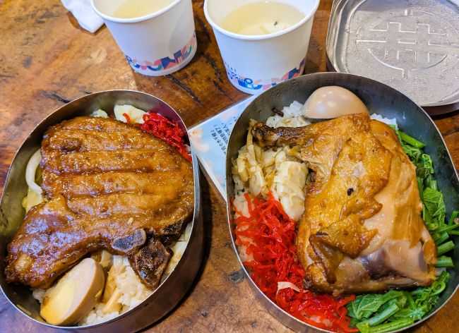台湾で「便當(ビエンタン)」といえば、弁当のことです。 二つのお弁当が写っている写真は、阿里山森林鉄道、奮起湖駅近くで売られている弁当です。容器が昔の奮起湖弁當を再現した金属製になっていて、保温を意識しているそうです。写っているお弁当は、鶏肉弁当と豚肉弁当です。このほかに鶏豚ミックスの弁当が売られていました。 カラフルな絵が描かれている弁当は、台湾高速鉄道(高鐵)の嘉義駅で購入した高鐵弁當です。鶏肉、豚肉、野菜の3種類の弁当が売られていました。写真は、野菜弁当で、弁当箱は経木で作られていました。【Bon appétit !】 The famous Fenqihu lunchboxes are closely connected to the industries in Alishan. Since Fenqihu is centrally located in the area, it was the best spot for workers in the logging and tea picking industries, as well as other businessmen to stop by and take a break. Fenqihu lunchboxes had started then and continued until today. Every shop features their unique flavors.(https://www.ali-nsa.net/en/explore/souvenir)