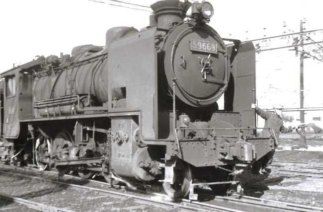 2枚の写真は、1969年3月に大宮機関区でみかけたキューロク59669です。 機関車の前面左横に操車係が立ち乗りしていて、キューロク59669を誘導しています。 車庫の前にキューロクやデコイチが勢ぞろいしています。一番左に停まっている機関車は59669です。