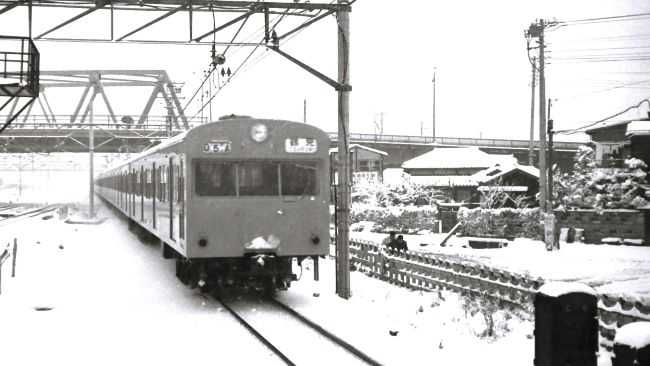 写真は、1969年4月に大垣駅で撮ったものです。 貨車の写真は、事業用貨車のラッセル式除雪車キ550形キ552です。複線用の構造で、進行方向に向かって左側に雪を排除します。 キ552は,東海道線関ヶ原付近で使用されていましたが、1986年に廃車となり、その後、住友大阪セメントに売却されたということです。 写真では、貨車は白色の帯を巻いているように見えますが、実際の帯の色は黄色でした。なお、この帯は、最高速度65kmを意味し、高速化不適格車とされています。貨車の記号も高速不適格車を識別するため、記号に「ロ」が追加され「ロキ」となっています。 電車の写真は、581系電車の特急「つばめ」です。世界初の交直両用寝台電車で、月光形電車の愛称があり、広範囲の地域において、昼夜兼用で広汎に使用されました。なお、写真の「つばめ}は昼間の特急です。