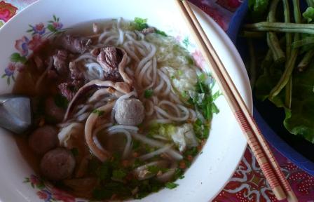 今日のカオピヤックには、珍しいことに、イカ、魚団子が入っています。フゥーに入れる半生の牛肉も入っています。