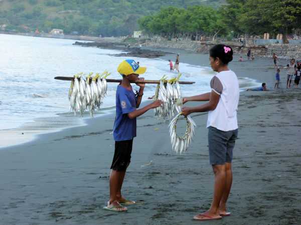 海岸へ行くと、道端で魚を売っている人をよく見かけますが、多くの場合大人が魚を売っています。時々、子供が売っている場合がありますが、海岸で竿に魚を釣るして売っています。