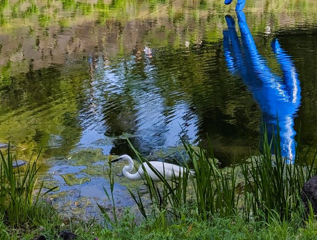心字池に、青い色の巨大な手が出現していました。よく見ると優しい手をしています。近くの岸辺で、幼い白さぎが、水をつつきながら歩いています。