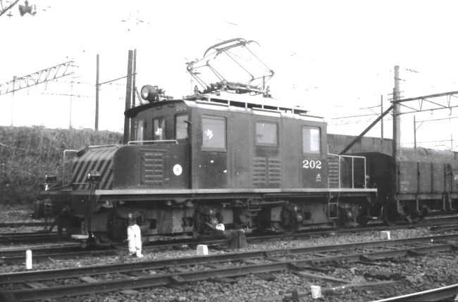 電気機関車は、名鉄瀬戸線大曾根駅で撮った名古屋鉄道のデキ 200 形デキ 202 です。デキ 200 形は、瀬戸電気鉄道により 1927 年に製造された車両です。 1978 年の名鉄瀬戸線の昇圧( 600 ボルト→ 1500 ボルト)まで名鉄瀬戸線で大曾根と尾張瀬戸間の貨物列車を牽引していました。