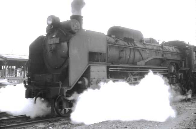 勢いよくドレンを切っている機関車と動輪が 4 つの機関車は、 D51 です。