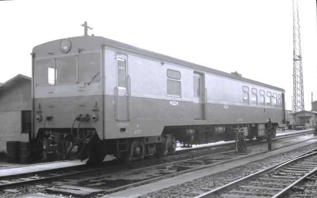構内に停車している気動車は、亀山機関区のキハユ 15 形のキハユ 15 4 です。この車両は、 1961 年に、キロハ 18 形のキロハ 18 6 を改造した 2 等郵便合造車です。トイレ・洗面台部分を運転室に改造し、旧 1 等室部分を郵便室とし、 2 等室部分は改造しないでそのまま客室として利用していました。