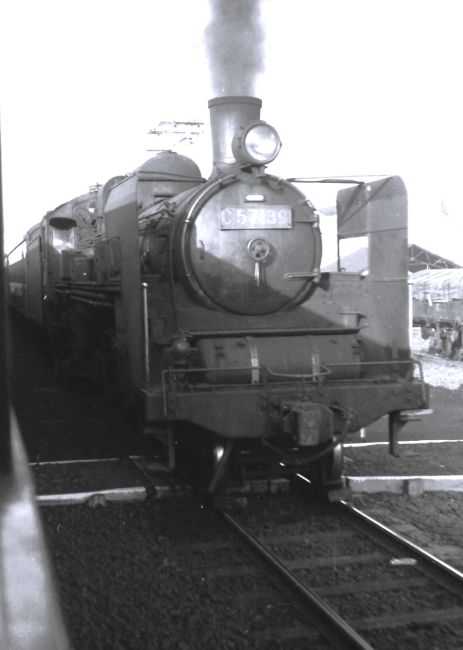 単機の蒸気機関車は、四日市で見かけた C57 形 83 号機で、門鉄型デフを有しています。門鉄型デフとは、門司鉄道管理局(小倉工場)式助煙板のことで、除煙板の下半分が切り取られています。