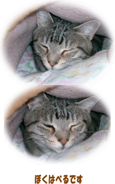 べるはまだ抜糸していないももを枕に、のんきに昼寝していますべる:う~~んやっぱ枕があると気持ちがいいにゃん~~もも:ちょっと重いけどお兄ちゃんならいいよ~~~私 :ももちゃん重くないの????? ももは大好きなべるが側にいてくれれば、ちょっと重くても 気にならないのかも知れません でも私は、べるにもう少しももに思いやりを持ってやれば 良いのにと思ってしまいました もしかして、親のしつけがわるいのかも、反省します