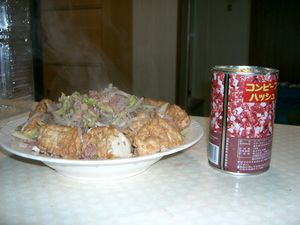 皆さん、コンビーフの缶詰めをご存知ですか???これも沖縄ではやはり良く使う物の1つです缶詰めの中身は牛肉を細かくしたものとじゃがいもを細かくしたもので味も少し塩味になっているので、味付けもいらないくらいですその缶詰めを使った料理をちょっと紹介します良かったら試して見て下さい 簡単ですから~~~これはコンビーフともやしとひと口大に切った厚揚げをフライパンで炒めるだけです 味はお好みでどうぞ???? こちらはコンビーフとちんげんさいを炒めただけのものですこちらも味は塩あじがついていますが 足りなければお好みでどうぞ あまり見かけないかも知れませんがどこかで見かけたらけっこう利用出来ますから、使って見て下さい、チャーハンやシチュー、やきそばなどなど使い道はまだ色々ありますよ~~~~