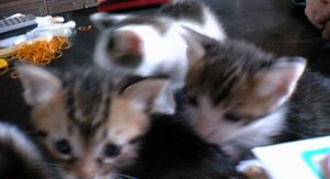 またまたしまちゃんの子ども達を撮りましたので見て下さいもうかれこれ産まれて1ヶ月になりますが、ずいぶん大きくなりやる事も達者になりましたよ箱から出ようとしたり、知らないでいると下からよじ登って箱の中に入ろうとしてみたり目を話すのがちょっと心配になって来ました ちょうどタイミング良くしまちゃんがえさを食べに箱から離れた隙に子ども達を下に降ろして写真を撮ろうとするんですが4匹がちょろちょろするので上手く撮れませんがなんとか4匹一緒に撮る事が出来ました今が一番可愛い時かも知れません近くのペットショップで写真を飾ってくれると言うのでちかじか持って行く予定ですもしかしてこの子たちを気に入って飼って下さる方が現われるかもしれません出来ればそれを期待したいと思いますなるべくなら野良ちゃんにはさせたくないと思っているんですが貰い手がなければ仕方がありませんが・・・とにかく私達も元気で成長してくれる事を願っています