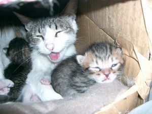 皆さんいつも仔猫の事でご心配下さってありがとうございます私達もなんとか良い方に飼って頂ければと願っていますでも、見事に哺乳瓶は失敗、仔猫たちに嫌われてしまいましただって口を開いてくれないんですもの仕方ないので、小皿にミルクを移してやったらペロペロ舐めだしたのでこれでやる事にしましたでも、しまちゃんの居ない隙をみて子ども達を箱から出してミルクをやるので、そのタイミングも難しいんですそうしないいとしまちゃんに引っかかれちゃうんですこれはミルクを飲んだ後の子ども達の表情ですこれからも少しずつですが粉ミルクや餌を増やしていければと思っています