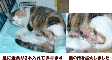 私の姉の所に2年程前から住み着いている野良のみいちゃんが交通事故に遭て病院へ入院しました足が複雑骨折しているので、金具を2本いれる手術を受けたのですが手術した所が腫れて来たので、先生がおかしいと思って血液検査をしたら今度は白血病である事がわかりました今後あまり長くは生きられないと言われたそうですとりあえず、家でゆったりと過ごさせてやるように言われてまずは退院しました 可哀想なみいちゃん、痛いのでしょうずっと鳴いています傷が早く治って少しでも元気になって欲しいと思っていますみいちゃん、頑張れ