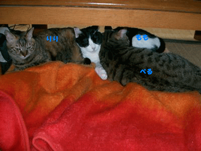 皆さん大変ご無沙汰してすいません めっきり秋らしくなりましたねって言うより今日は少し寒いですね 風邪など引かないようにして下さい 家の3にゃんも寒いので、毛布の上でだんご状態で 暖をとっているようです でもこういう光景はめったに見られない事ですので ブログに載せてみました、二度と見られない光景かもしれません りりはちょっとなんで私の側にいるのって顔してますよ~~~~~ だってリリは1人が好きなんです
