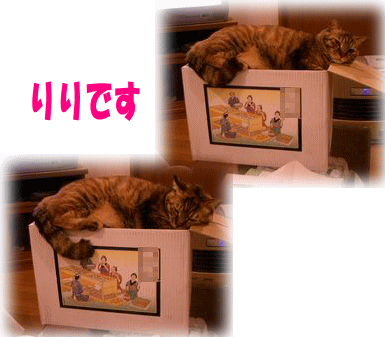知り合いから、おせんべいの詰め合わせが入ったダンボールが届きました。 りりはこのダンボールが気に入ったのか、 箱の上でくつろぎ始めて、どいてくれません パパ:りりちゃんおせんべい食べたいんだけど 下りてくれないかなぁ~~~~ りり:だってここ座り心地いいんだもん・・・・ パパ:パパにおせんべい食べさせてよ~~~ りり:もうちょっと待ってて・・・・・ パパとりりが私はこんな会話をしているように思えました