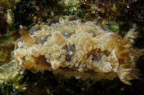 海の中を見るのが好きな私たちは、素人ながら海の中でも写真を撮る。でもスノーケリングをしながら海の生き物の写真を撮るのは思ったよりも難しい。まず、波や流れで自分が動いてしまうし、相手も生き物なので動く。さらに本格的なフラッシュなどを持っていないので、写真が暗くなってしまい、後で見てもなにを撮ったのかよくわからないということがしばしば起こる。 今回、式根島の海でもいっぱい写真を撮ったんだけど、何枚か、きれいに撮れたものがあった。 ひとつはこのウミウシ!ウミウシはあまり動かないので助かります。 ウミウシマニアの人のサイトを見ると、ウミウシにはすごくたくさんの種類がいるらしい。その中で近いものを探すのは結構大変だったんだけど、どうやらこれはミヤコウミウシというらしい。 右側についているフリルみたいなのはえららしい。こうやってよく見ると、本当に地球上の生物ではないみたいな、非現実的な姿。去年男鹿の海でアオウミウシを見たときには、新種の生物発見か!?と本気で驚いた。後でインターネットで調べ、ウミウシの中でもよく見られる種類だと分かったんだけど。