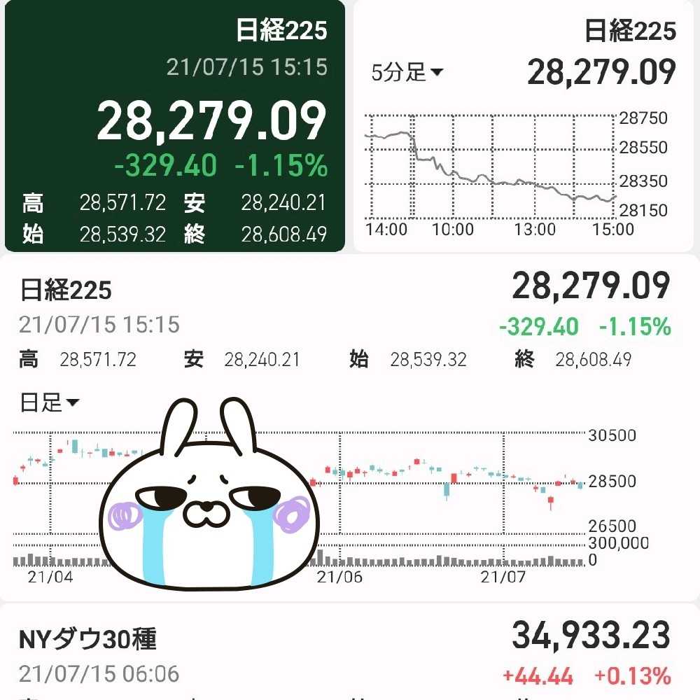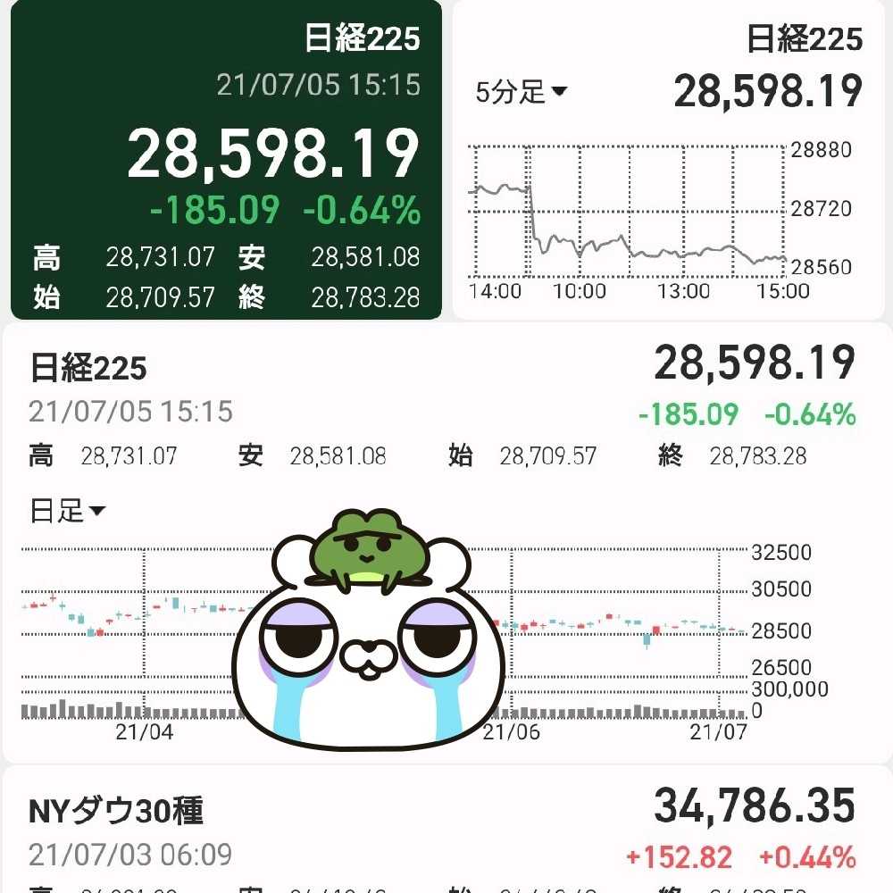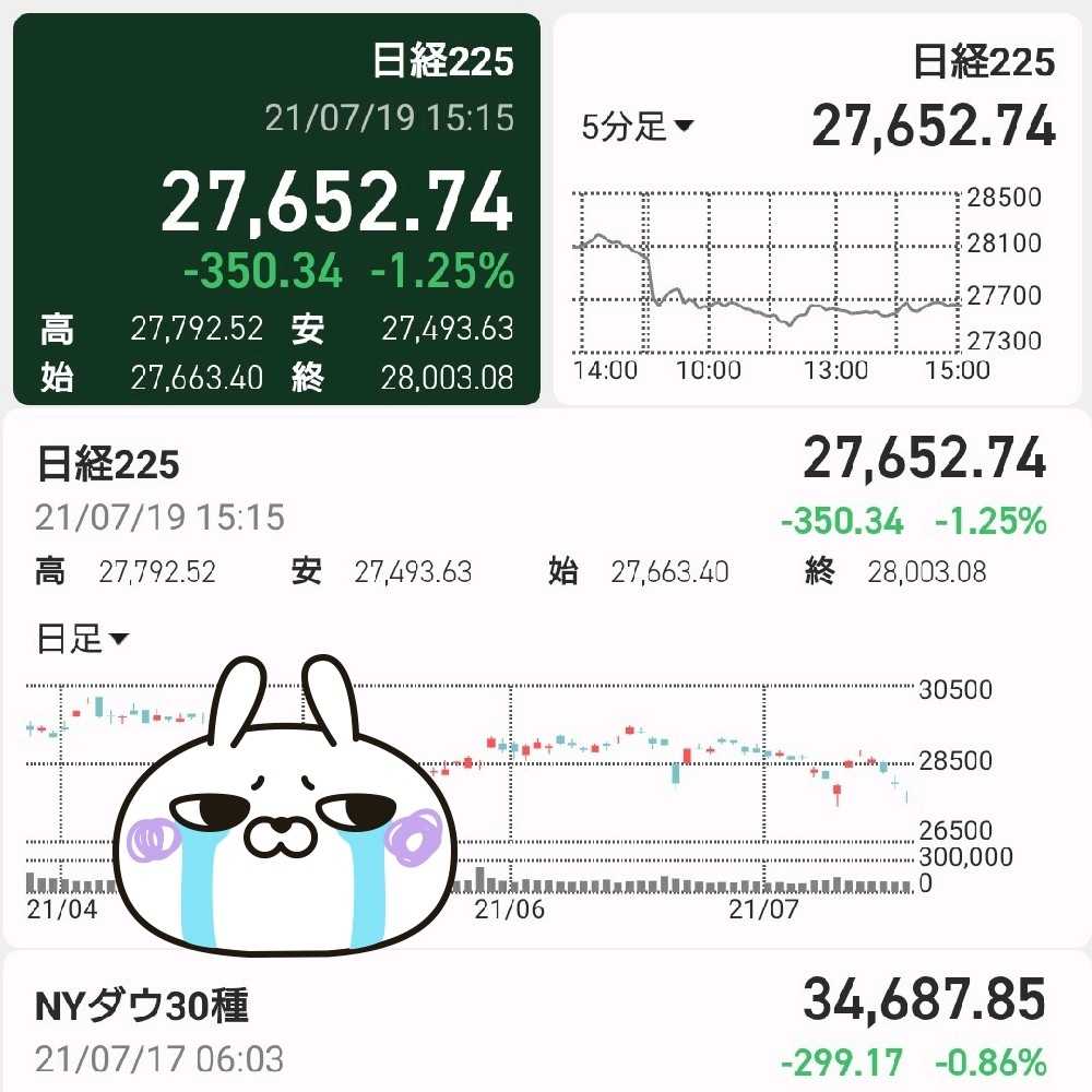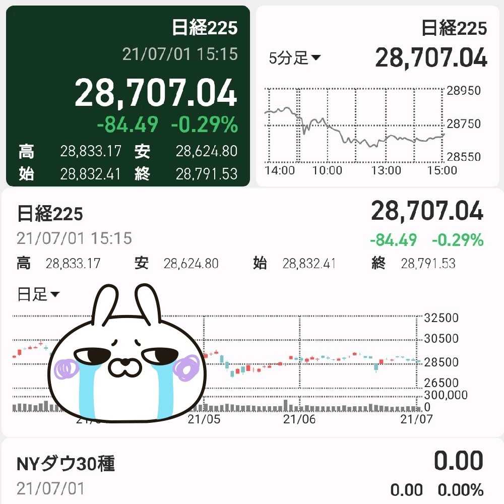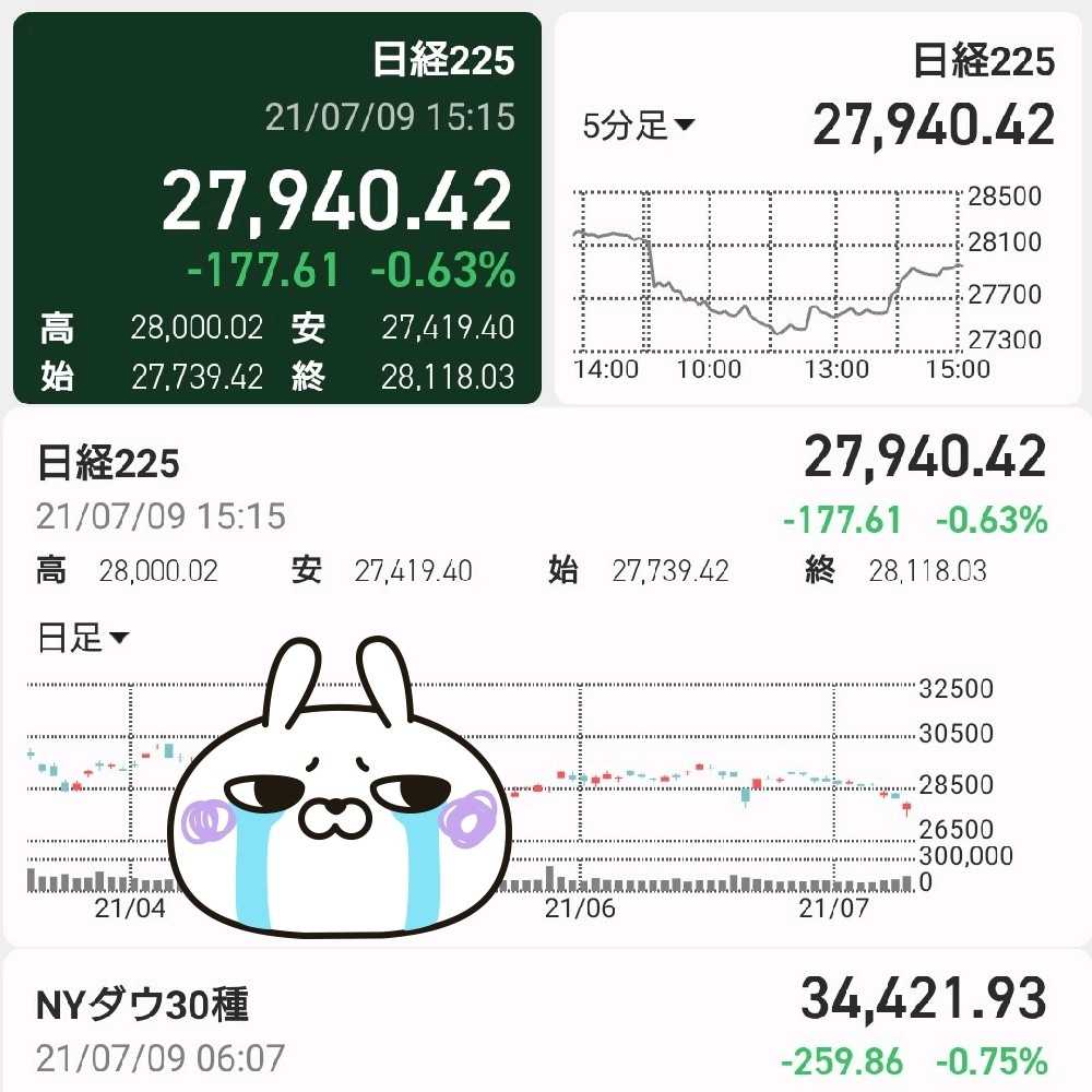 本日の日経平均株価。マイナスでした。 厳しい相場が続きますね。 最近は、ほぼ、デイトレでしか、利益が出せなくなってきました。 でも、利益が出せただけでも良しとします。 7年くらい前までは、東京オリンピックのおかげで日本の株価も上がるんだろうと思っていましたが、コロナでこんなになるなんて、、、 と言っても、コロナ渦でも日本株は、以外と頑張ってくれていると思います。 東京オリンピック、せっかく開催されるので、楽しめたらいいなと思います。 明日もいい日になりますように☺️