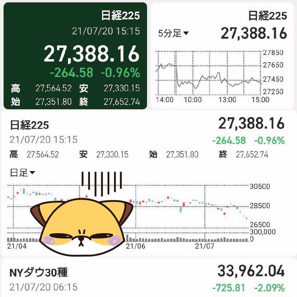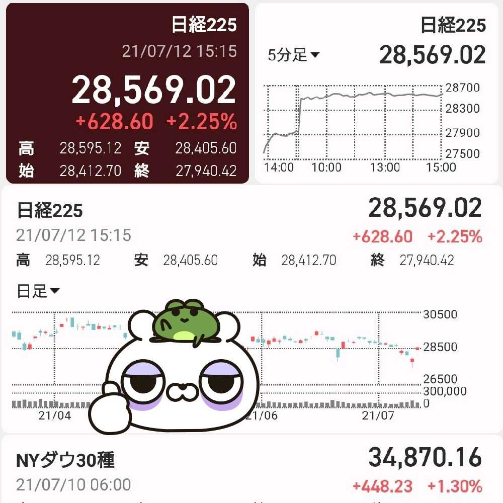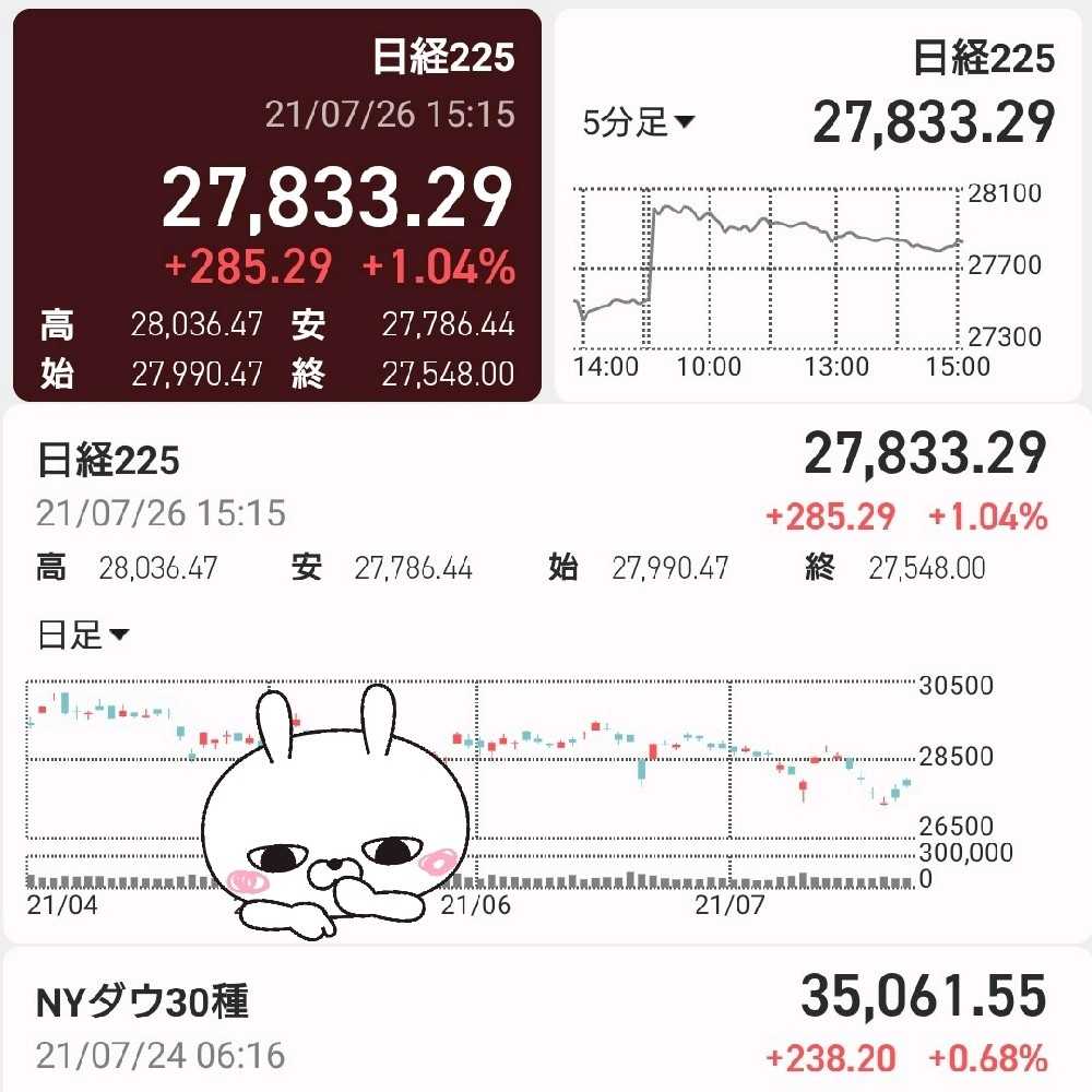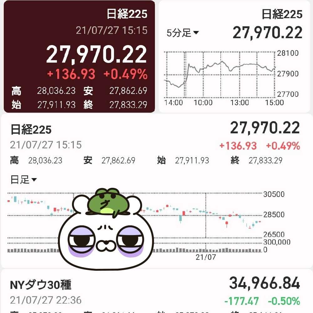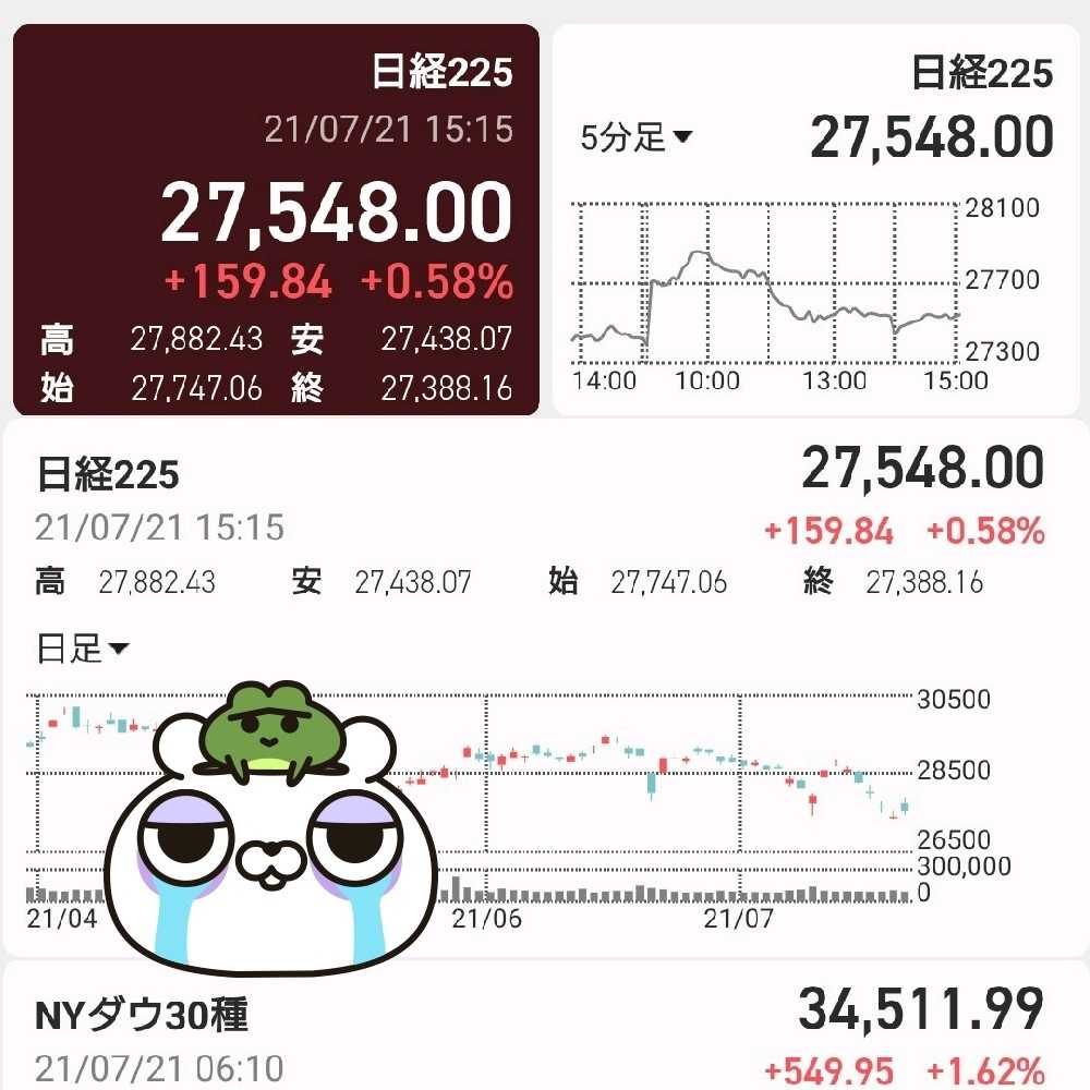 NYダウだけを見て萎縮していましたが、他のアメリカの株価こんな感じ。 とは言え、最近の日本の株価を思うと不安しか無かったですが、結果は、こちら コロナ感染者が増加していますが、それにも増して、オリンピックで、日本の選手が頑張ってくれていることもあってか、プラスでした。 個人的には、久々に1日の目標を達成出来ましたが、油断できないと思っています。 とりあえず、明日は大明日&天恩日&神吉日。 良いことありますように。