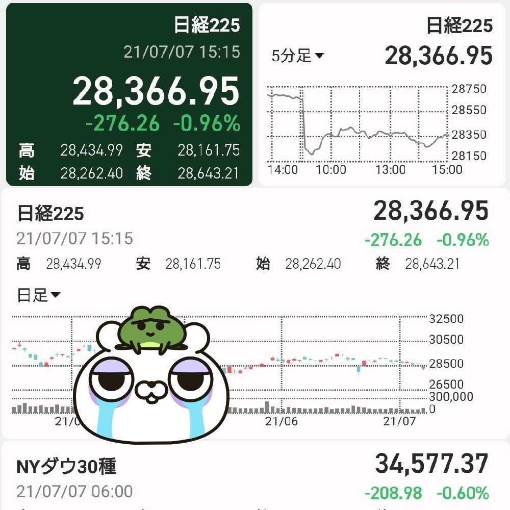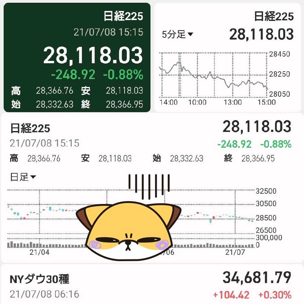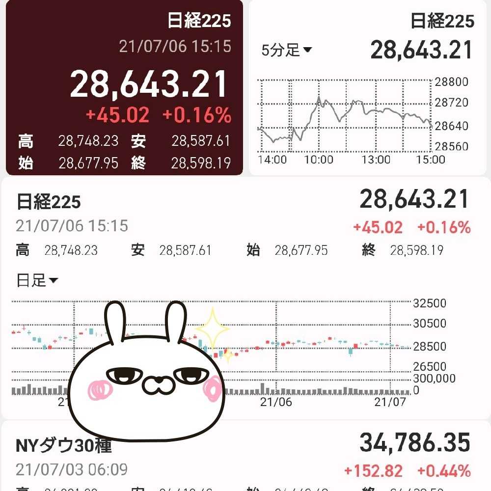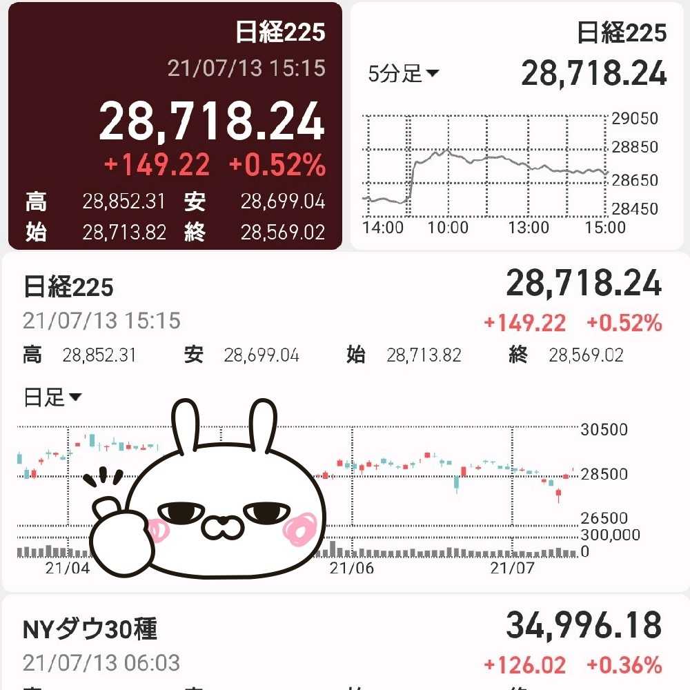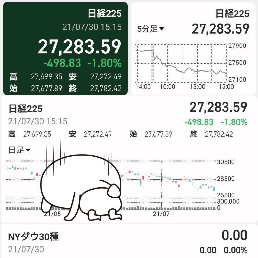 NYダウだけを見て萎縮していましたが、他のアメリカの株価こんな感じ。 とは言え、最近の日本の株価を思うと不安しか無かったですが、結果は、こちら コロナ感染者が増加していますが、それにも増して、オリンピックで、日本の選手が頑張ってくれていることもあってか、プラスでした。 個人的には、久々に1日の目標を達成出来ましたが、油断できないと思っています。 とりあえず、明日は大明日&天恩日&神吉日。 良いことありますように。
