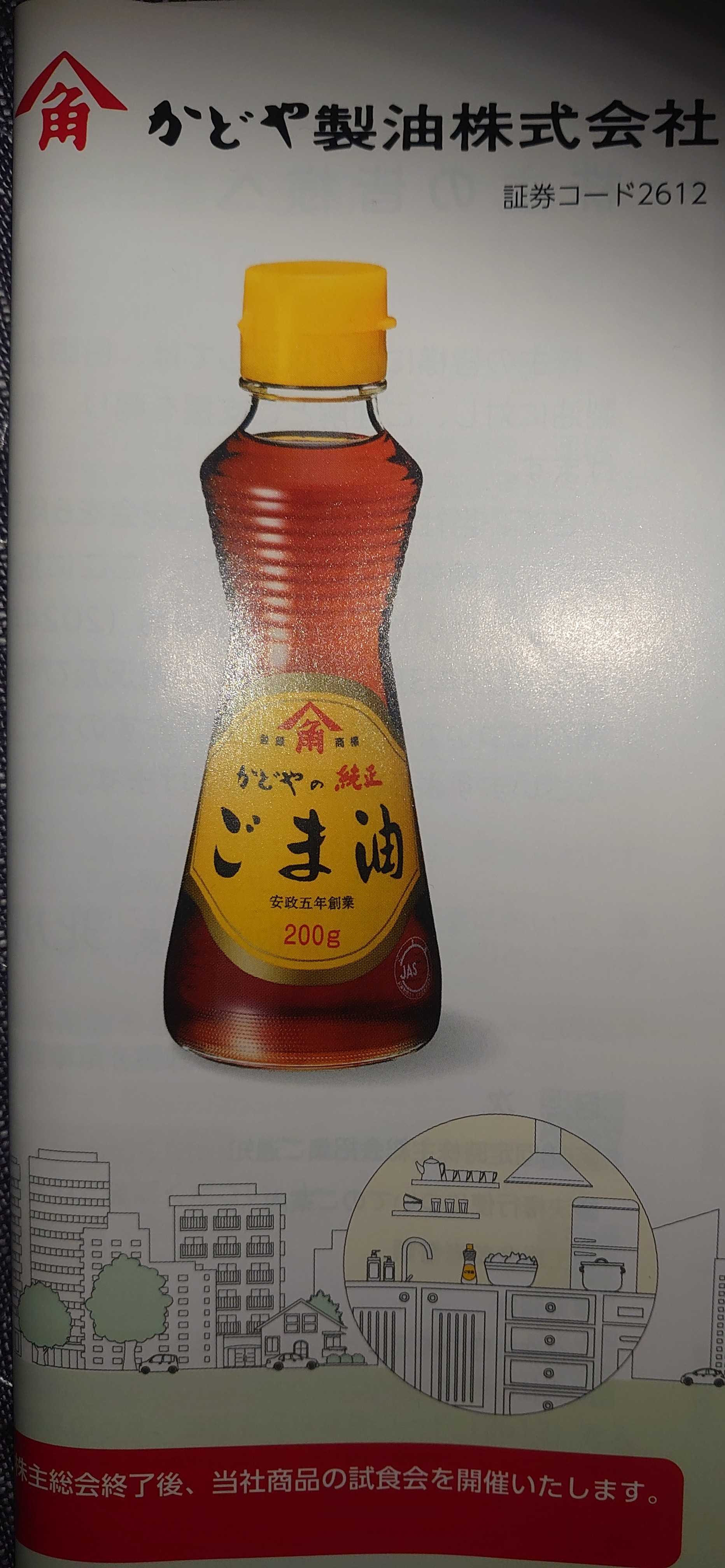 かどや精油株式会社(2612)さん 6月20日現在の株価は、1株 3620円位で、優待がもらえるのは、100株からになります。 割り当て基準日は3月31日です下に埋もれていますが、素麺なども入っています。 自分の会社だけのものではなく、地元の企業の商品も入っていたりします。 毎年大体若干内容は変わりますが、こんな感じです。 油は、料理で確実に使うので、とてもありがたいです。 ご参考まで。