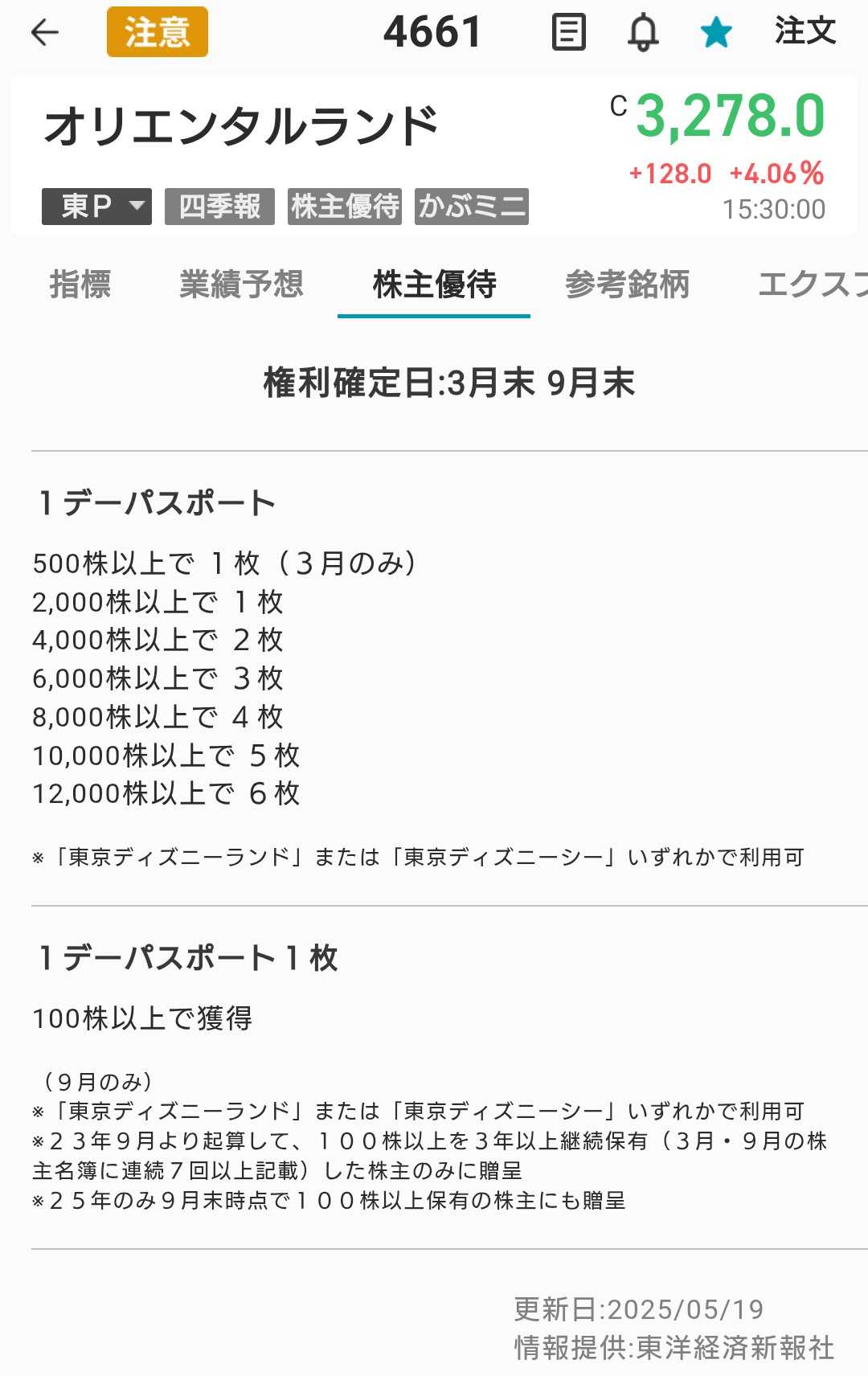 私も、高齢なので、見誤った情報を流したく無いので、興味のある方は、ご自身で検索して、確かめて、興味があれば参考にしていただきたいこと。 オリエンタルランド(証券コード:4661)さん(かわいいネズミさんで有名なテーマパークを運営) 今年の9月末時点で、100株(1単元)保有していると、いつもよりはお得かも。 とはいえ、その権利確定前後の株価、私的には上下しそうと予想ですね。 ○私の個人的には、だいぶ前から保有していたので、ここ1年ちょっとは、結構な下落傾向で、足を引っ張っている銘柄の一つです。↓ 参考までに、私がお得と思った元になった楽天証券さんのアプリで見られる株主優待情報のスクショ 画像した部分の、1デーパスポート1枚の、※印一番下の情報です ⚠️ 投資はあくまで自己責任でお願いします。