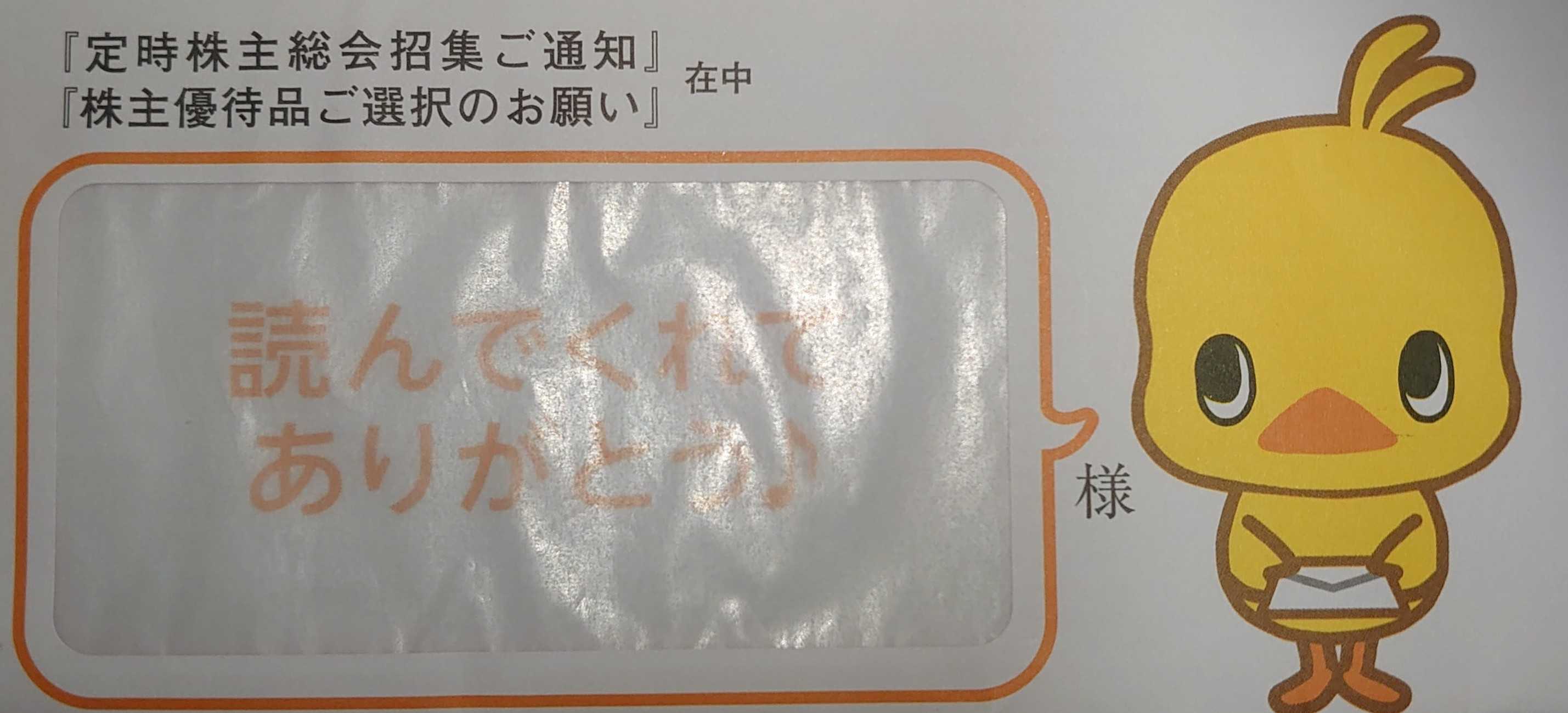 定期株主総会の招集通知が続々と、、、、 先週も何通か届きましたが、昨日は4通、本日は3通届きました。 総会招集通知とまとめて優待の通知が来たり、優待が同封されてくる会社などもあります。 昨日届いたうちで、封筒が好きだったところ、、、↓日清食品ホールディングス(2897)さんひよこちゃんがかわいい中に入っている通知↓ ひよこあにき個人的には、あんまり好きじゃない。 一応、招集通知、 色々な会社から来るので、来たらなるべくその日のうちに、大体確認して、スマホで議決権を行使します。 株主総会も行ってみたいのですが、大体会場が遠いので、行ったことありません。 招集通知書などの送付されてくる書類、 結構会社のカラーが出ていたり、見やすいようにかなり力を入れている会社があったり、よく読むと、こんなこと書いてあるんだとか、この人(有名な方)が取締役なんだとか、取締役の年齢層とか、男女比率とか、取締役の方の経歴とか、、、 地味にためになります。