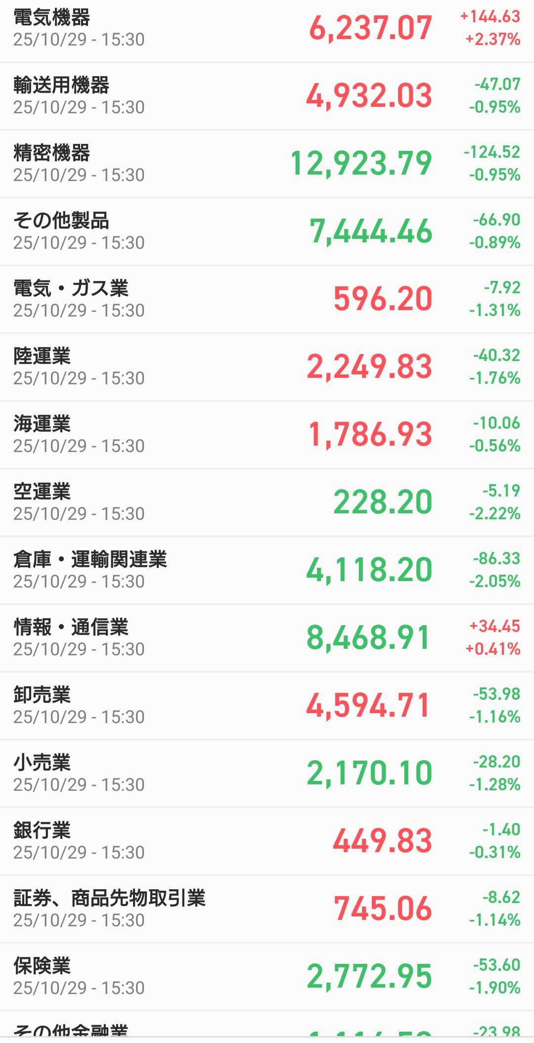 楽天の株取引のスマホアプリである、iSPEEDで、株価がプラスの業種(楽天のアプリでは、全33業種あり)を見てみたところ、、、
