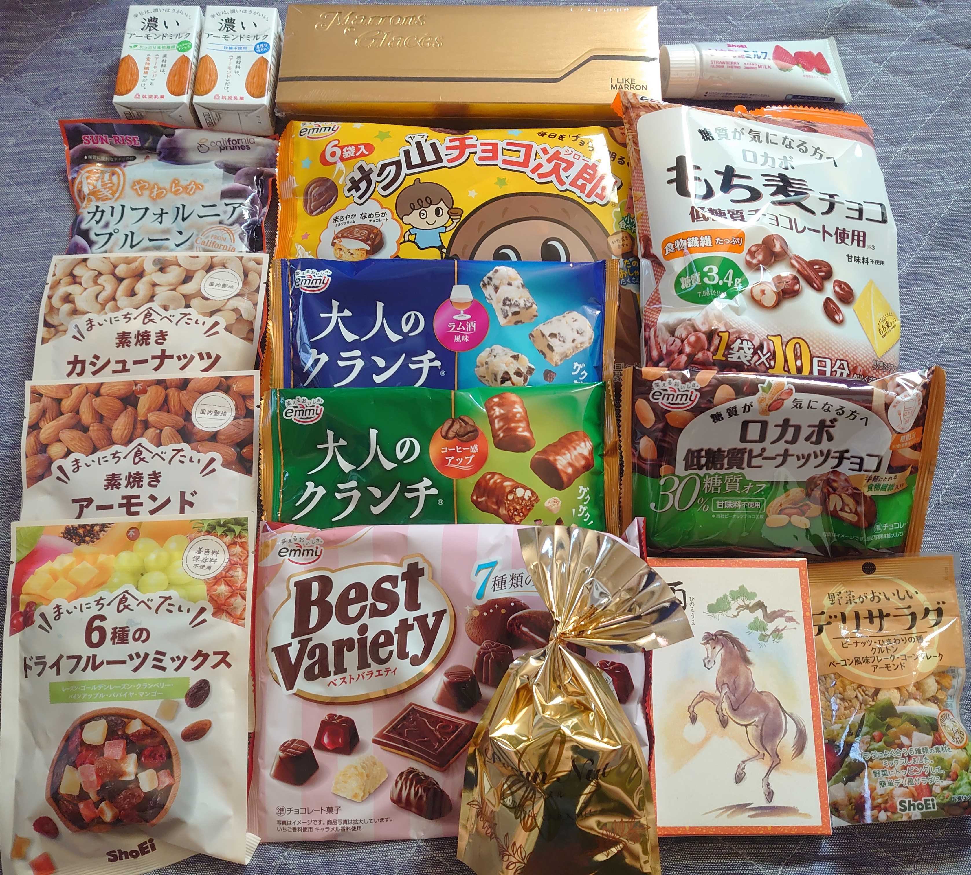 一応、記録のために、簡単に届いた商品↓の商品名などをリストアップ⭕️お菓子系 ・干支チョコレート ・ロカボ低糖質ピーナッツチョコ ・ベストバラエティ(チョコ菓子やクッキーなど) ・大人のクランチ 薫るクッキー&クリーム(ラム酒風味) ・大人のクランチ 香るキリマンジャロ ・サク山チョコ二郎 ・ロカボもち麦チョコ ・マロングラッセ ゴールド(5個入り) ⭕️ナッツ、ドライフルーツ系 ・野菜がおいしい デリサラダ(ピーナッツ、ひまわりの種、クルトン、ベーコン風味フレーク・コーンフレーク、アーモンド)サラダに加える、ふりかけ的なもの ・素焼きカシューナッツ ・素焼きアーモンド ・6種類のドライフルーツミックス ・ピーカンナッツ(キャラメル掛け) ・種ぬきやわらかカリフォルニアプルーン⭕️その他 ・濃いアーモンドミルク(砂糖不使用)125ml ・濃いアーモンドミルク(たっぷり食物繊維)125ml ・いちご印ミルク(加糖れん乳) 以上 個人的に、ナッツやドライフルーツを、昔からよく購入していましたが、今まで購入していた商品は正栄食品工業さんのものではなかったのですが、、、、 最近私の近所のお店でよく見る取り扱っているナッツ類やドライフルーツ系、よく見たら、正栄食品工業さん取扱いのものでした。 普段の生活や口コミなどの情報から、売れている商品や、自分がいつも良いと思って使っている商品を取り扱っている会社に注目する事も、投資の情報になるのだと、改めて思いました。