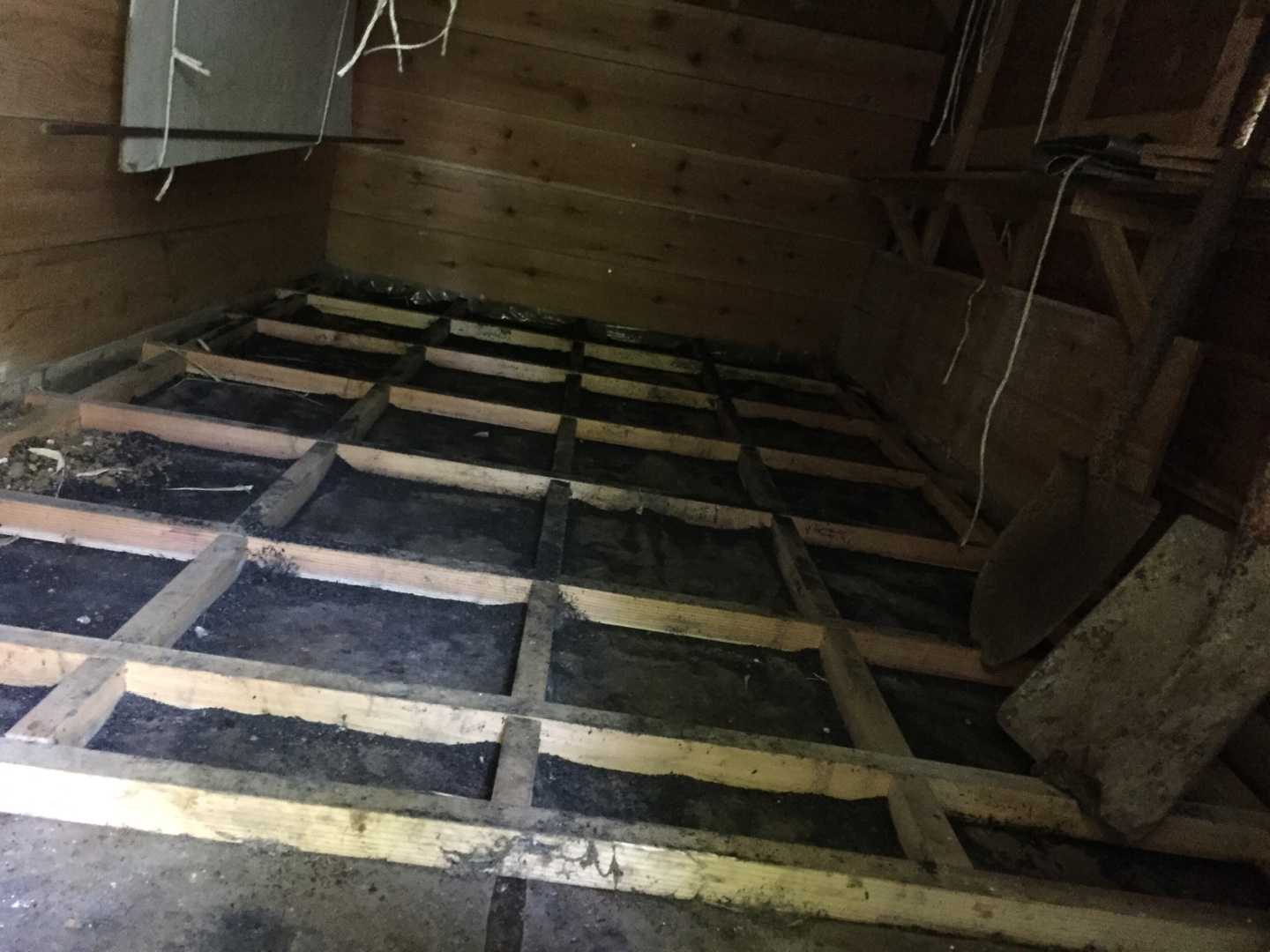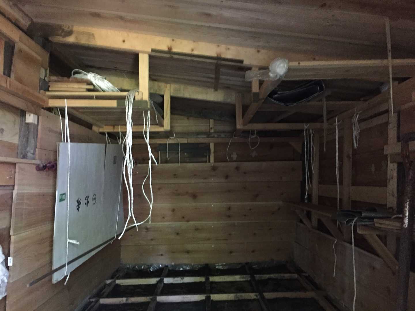 左はテント マットなど 右は草刈機(半分になる電動の)を置いていた、右の中段には床の板を置き、板 室内の乾燥を考慮した、
