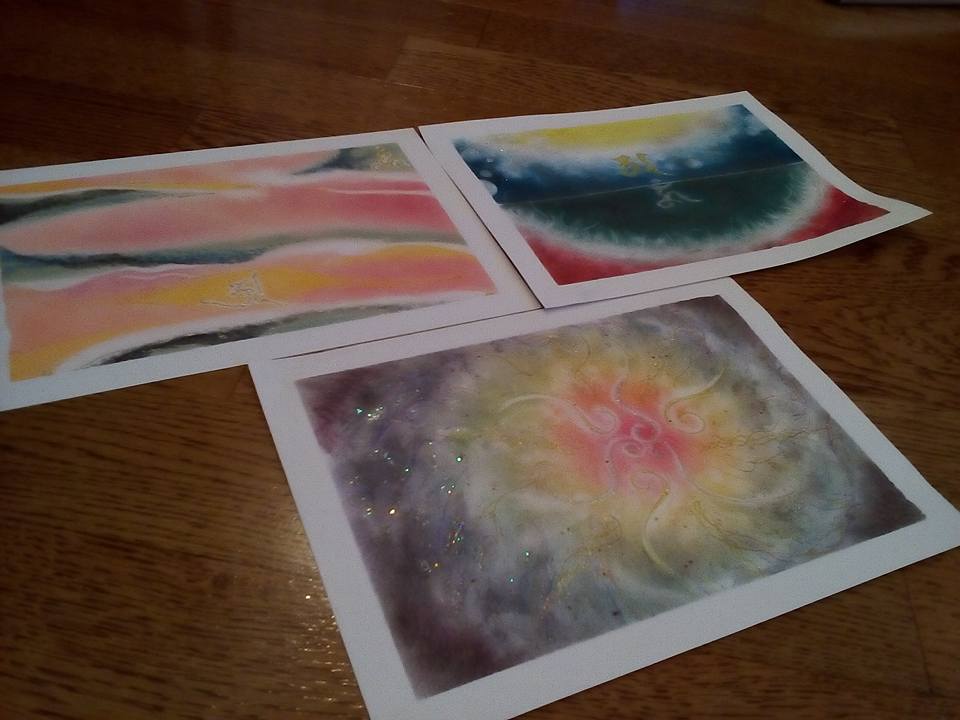 パステルを塗り込んで行って、そこから消していく事で現れてくる模様。。。色。。。