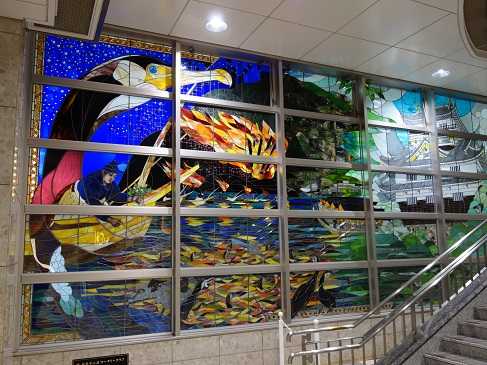 にほんブログ村 以前、何度か名古屋地下鉄の構内にあるモザイク壁画をご紹介しました。モザイク壁画は無機質な駅の構内に彩りを与えてくれます。名古屋に限らず、各地域の駅では構内の装飾にも工夫があります。例えばJR岐阜駅には、大きなステンドグラスがあります。左半分の大きなウと脇の人物の姿から、鵜飼の様子だとわかります。右半分は、岐阜城なのでしょう。各地の駅の装飾も、よく見れば芸術性があるものです。ただ電車ㇸ駆けこむのではなく駅構内を見渡せば、意外な発見があるかもしれません。【 ブルーベリーくりーむチーズ大福 】 < ↓ ランキングクリックはこちらから > にほんブログ村
