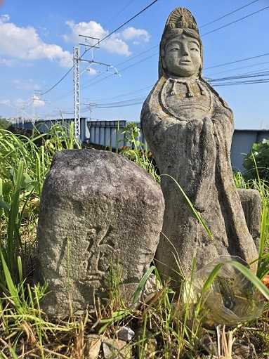 にほんブログ村 矢作川橋近傍の推定・高見観音、現地確認の最終回です。今回は弘化2年の石碑についての確認です。結論としては、やはりこの石碑は観音像の転倒防止に使われていました。1)観音像が石碑と台座側に傾いて置かれている 次の写真を御覧ください。 観音像は台座に支えられるとともに、石碑側に傾いています。 石碑が観音像の転倒防止に役立っているのがわかります。2)石碑が前向きに傾いている 観音像手前の弘化2年の石碑は、大きく前傾しています。 観音像の支えとしての意図がうかがわれます。3)石碑,台座と観音像の間に詰め物がある 次の写真でおわかりでしょうか。 台座と観音像の間に瓦の破片が詰められています また石碑と観音像の間にも数個の石が詰められていました。 観音像を固定しようとする意図がみられます。4)詰め物の瓦は小石は固定があまく、実際は機能していない 詰め物には隙間があり、固定されていません。 実際には観音像の固定には役立っておらず、 プロの業者の仕事ではありません。 最終的な観音像の設置は、地元の素人が行ったと推定できます。以上から、弘化2年の石碑は、観音像の転倒防止に使われていると確認できました。また詰め物の緩さなどから、最終的には地元住人が設置に関わったと思われます。幾つもの項目が判明し、有意義な現地確認でした。それにしてもこの場所は、意外に電車からは目立つ場所です。私の現地確認中でも、往復5~6本の電車が鉄橋を通過しました。さすが運行本数の多い名古屋鉄道本線です。電車の車窓から見ていた人からは、雨に濡れながら、草むらに埋もれて、巻き尺を手にした不審者が見えたことでしょう。【 防災対策: 非常食 】 < ↓ ランキングクリックはこちらから > にほんブログ村
