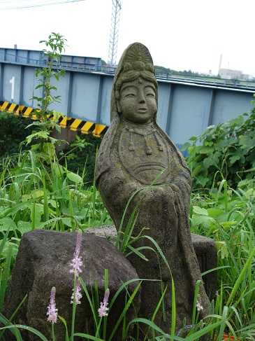 にほんブログ村 「FDG公式さん」が発見された矢作川橋近傍の推定・高見観音。現地確認の結果、私の見解の誤りに気づきました。幾つか訂正点が在りますので、現地確認の経緯も含めてご紹介します。私は名古屋鉄道本線 矢作橋駅で下車し、徒歩で現地に向かいました。天気予報が外れ、現地はかなりの雨降り。悪条件での散策となりました。駅から東にしばらく歩きましたが、現地への道にアクセスできません。仕方なく、一旦国道1号線に出て、車道を横断しました。さらに橋の手前で車道沿いに南下すると、目的の小道への入り口に遭遇。入り口には鎖が張られ、徒歩でしか入れません。その道を傘をさして、矢作川沿いに歩きました。しかし観音像は見当たらず、舗装道も終わりました。その奥の鉄橋で土手道も行き止まりのようです。とても不安になりながら、さらに奥に進みました。するとたくさんの花が咲くその奥に、観音像が見えてきました。情報があってもこの難易度。FDG公式さんの新発見にはあらためて驚嘆します。ところでこの場所にたくさん自生しているこの花は「ヤブラン」でしょうか?ご存知の方は教えてください。さて、思っていた以上に綺麗な観音像でした。一目で私の見当違いに気づきました。傘を差しながら、観音像の高さを計ると地面からの高さは65cm。私はこの観音像は高さ120cmクラスと勝手に思い込んでいました。この大きさの認識違いがきっかけで、他の見解の誤りにも気づきました。やはり現地確認は重要ですね。なぜ観音像の寸法が重要で、私がなぜ寸法を計るのか。その理由や、見解の訂正について、次回お話します。【 多機能防災ラジオ 】 < ↓ ランキングクリックはこちらから > にほんブログ村