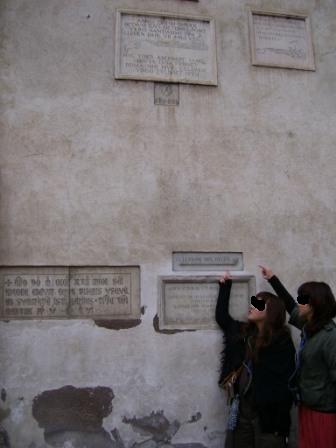 2007年10月22日(月)の続き 次はミネルヴァ広場。広場の中央にはベルニーニ作の象の彫刻のうえに紀元前6世紀のオベリスクを乗せたほっとユニークなモニュメントがあります。 このモニュメントの正面にやや殺風景なサンタ・マリア・ソプラ・ミネルバ教会があります。ソプラとは「上に」という意味で、教会名を直訳するとミネルヴァの上の聖マリア教会とうことになります。カエサル(シーザー)のライバルだったポンペイウスが建設したミネルヴァ神殿の上に、13世紀に教会が建築されたものだそうです。 ミネルヴァは知恵をつかさどる女神で、ギリシャ神話ではアテネと呼ばれます。 この教会にはたくさんの美術品が収蔵されているそうで、我々は15世紀後半に活躍したアントニアッツォ・ロマーノという人の「受胎告知」という絵をじっくり観ました。 サンタ・マリア・ソプラ・ミネルバ教会の壁。 テヴェレ川が氾濫したときの水位を示す銘板。 美術品を堪能してから教会を後にしてコロンナ広場に向かいました。 この広場はキージ宮(総理府)の前であり、近くには下院もあるので、警官の姿とパトカーが目立ちます。警官の制服はスマートでかっこ良く、パトカーはアルファロメオ。ここはイタリア。 コロンナ広場にあるマルクス・アウレリウス帝の記念柱(180年) この柱は帝によるサルマシアの戦いとゲルマニアの戦いの様子を表した 浮き彫りで埋められています。高さは30m。 そして最終目的地コンドッティー通りまで歩いてツアーは解散。 このコンドッティー通りは、有名ブランドのブティックがずらりと並ぶ、パリならシャンゼリゼ、日本なら銀座といったような通りです。東へ向かっていった突き当りがスペイン広場です。 これでやっと2日目の午前の部の終わりです。次からは午後の部に移ります。 迅