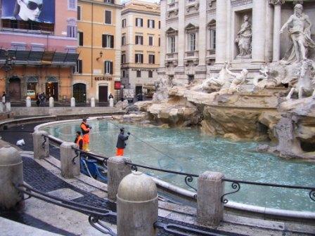2007年10月24日 ローマ4日目 朝のトレビの泉 昨夜の騒動を無事乗り越え、朝も早くから朝食を取り、8時前にはホテルを出ました。何といっても、今日が実質ローマ最後の日です。おととい見られなかった行きたいところを全て回って、子供たちや甥、姪、友達へのおみやげをゲットしなくてはならないのですから、いつまでも寝ているわけには行きません。 ということで、本日最初に行くところはトレビの泉です。2日目と同じように地下鉄バルベリーニで降りて歩いて数分のところにそれはありました。 さすがにまだ観光客はいませんでしたが、掃除をしている人たちがいました。 気がつきましたか。真ん中の人の右肩あたりから右方向に茶色い帯が見えませんか。あれはコインの帯なのです。左側の人がT字上の棒でコインを帯のように寄せて、右側の人がホースの先につながった棒を使ってコインを吸い込んでいきます。ホースは右手前に見える青い集じんポンプつながっていて、コインはポンプ内のフィルターにつかまってジャラジャラと音を立てていました。 すばらしい彫刻たちですね。 ここは、観光客が集まってきて、観光スポットらしいトレビの泉になったころにもう一度来ることにして、ヴェネツィア広場からフォロ・ロマーノを経由してサンタ・マリア・イン・コスメディン教会へ向かいました。もちろん歩いてです。コスメディン教会にはあの「真実の口」があるのです。迅