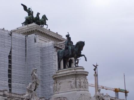 2007年10月22日 午後の続き ここまでの踏破距離はおよそ5Kmとちょっと。これには見学した施設内をぐるぐる巡った距離は含まれていません。 「聖テレーザの法悦」に2回目のヒジ鉄をくったので、おとなしくフォロ・ロマーノに向かうことにしました。 どの道を通ったのかは覚えていませんが、目の前に突然ヴェネツィア広場が現れました。巨大なヴィットリオ・エマヌエーレ2世の騎馬像がそびえ立ち、その後ろには巨大な白亜のヴィットリオ・エマヌエーレ2世記念堂が堂々と立っています。 V.エマヌエーレ2世のことは、ほとんど知りませんでした。1870年のイタリア統一の立役者で初代国王なのだそうです。 残念ながら、記念堂は修復中で養生ネットが張られていてその威容の全体を拝むことはできませんでした。 記念堂の裏、市庁舎の立つカンピドーリオの丘の向こうには遺跡群が広がります。これが「フォロ・ロマーノ」。 7つの丘の中心にある低地で、古代ローマ時代には市民集会や裁判、商業業活動や政治討論の場が設けられた公共広場で古代ローマ発展の中核地だったところです。 セヴェルスの凱旋門とフォロ・ロマーノ(北側の丘からのながめ) ザトゥルヌスの神殿 元老院議場のまえで 一番南にあるティトウスの凱旋門 コロッセオの二階からフォロ・ロマーノを眺める(南側から) 皇帝たちの凱旋門や神殿や集会場の後がひしめくように立っています。全て2000年以上前の建物ばかりです。興奮しますね。 フォロ・ロマーノを縦走するとコロッセオが見えてきました。次はローマ観光の定番のひとつコロッセオに入ります。迅