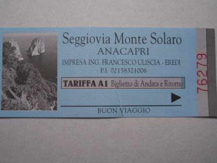 2007年10月23日 ローマ3日目 カプリ島ソラーロ山へ 昨日(2007年11月24日(日))の「世界不思議発見」はナポリ、カプリ島、ポンペイ遺跡がテーマでした。 カプリ島の青の洞窟も出てきましたが、入り口が小さくて小船に寝そべって入っていくところが写っていました。撮影のときも結構波が高そうで、波の低くなったときを狙って船頭さんが鎖を手繰って洞窟へ無理やり入っていくといった感じでした。取材班は運が良かったのですね。 さて、リフト乗り場にならんでいよいよソラーロ山に登ります。リフトはスキー場にあるリフトとまったく同じで落下防止のバーが付いています。 リフトの乗車券(往復) プチッと破られて改札終了 少し登ったところからの風景(リフトより) もうちょっと上からの風景(リフトより) 風はそよ風でちょっと涼しいかなという感じ、太陽の熱で十分暖かでした。山頂は寒いのかと思いましたが、太陽のおかげで震えるようなことはありませんでした。 山頂展望台からの眺め 海が碧いでしょう いやあ~、山頂からの眺めはすばらしかったです。見渡す限りの碧い海、開放的になりますねえ。しばらくとどまっていたかったのですが、ガイドから頂上には10分間だけと言われていたので、みんな渋々くだりのリフトへ向かいました。(ガイドは下の乗り場で待っています) 下に下りたらバスが待っているのかと思ったら、斜面の道にずらっと並んだみやげ物屋めぐりをさせられました。名物レモン酒なるものを試飲させられて熱烈に勧められましたが、結構アルコール度がきつく、味も癖があり、おまけに値段も高い!ので遠慮しておきました。このレモン酒なるものは、どこのみやげもの屋にも置いてあって値段は大体同じでした。 みやげもの屋街道をずっと進んでいくと建物がなくなり、視野が急に開けたところに出ました。ここからの眺めも絶景でした。 帰り道にみやげもの屋を冷やかしながら歩いている内にタイムアップ。いよいよバスの時刻。また、細い道をアクロバティックな運転で船着場へと向かいました。 再びジェット・フォイルでナポリへ、船内ではほとんどの人が眠っていました。私もうとうとするうちにナポリに到着。 ポンペイ組は既にナポリの船着場に到着しており、カプリ組みがバスに乗ったら即出発。ローマまでは約3時間半の道のり、到着は午後8時半ごろの予定。 中間地点でみやげもの屋に途中下車。こっちはサービスエリアがなくていったん高速道路を降りて旅行客目当ての休憩所兼みやげもの屋によるようです。 みやげもの屋の入り口で、トウセンボした日本語がうまいのか下手なのかわからないケバイお姉さんが、店内の説明と割引クーポンを配ってくれてトイレへGO! 落ち着いたところで、職場へのおみやげ(クッキーやチョコ)を買い込んで、義理のあるところへのみやげはクリヤー。世話になっている会社の事務員さんには、オリーブオイルのハンドクリームを追加で買ってゴマをすります。 本日の行事をほぼ終えて、今夜遭遇する大事件?(と本人たちはそのとき思った)のことも知らずに、バスに揺られてうつらうつらするのでした。 23日はまだまだ終わらない。 迅