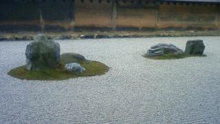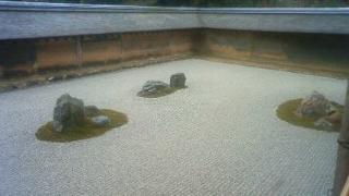 あいにく、石庭のある方丈の屋根工事のため、足場が組まれ、仮の鑑賞台によって石庭は4分の3しか見えません。