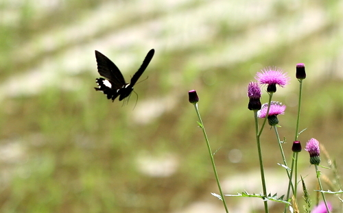 モンキアゲハ アゲハチョウ科1955年ごろ大阪付近では八幡の岩清水八幡宮か淀川をはさんで宝寺しか見ることが出来なかった。その頃樟葉から渡し舟があり、こころ弾ませながら採集に行った記憶がよみがえる。今ではずっと寒冷地の篠山でアゲハチョウの中でも見る機会が多い種類になっている。南方系のチョウで温暖化の目安になる。日中の暑い時間帯にも活発に飛び、ユリ類、クサギ、ヒガンバナ、人家の庭先の園芸種など各種の花に訪れる。幼虫はミカン類、カラタチ、サンショウ類、などのミカン科植物を食草とする