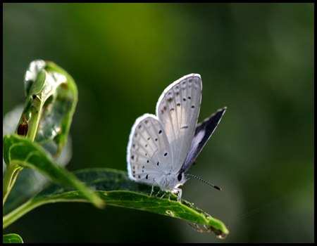 ようです。翅の表面は、オスは明るい青藍色、メスは外縁部が広く黒褐色、裏面は白の