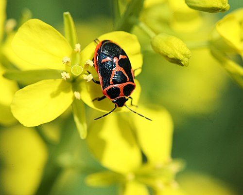 赤と黒のスーツが黄色の菜の花によく似合う。体長は7~9mmでアブラナ科の植物に