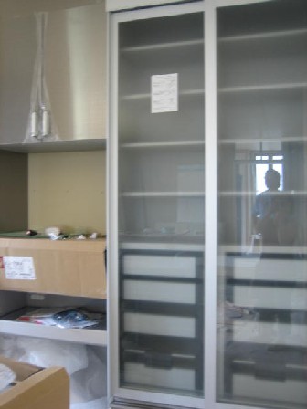 金曜日の打ち合わせで、真っ先に家に入ると目に付いたのはキッチン!カップボードや食器棚が見えてるし、カウンターも取り付けられてる~♪でも打ち合わせが先、先。はやる気持ちを抑えながら、トイレや2階の様子を確認して、さて~キッチンだ!リビングの部分は狭い上に、沢山モノが置かれてて作業中だし、キッチンも近くからの撮影だし、保護ダンボールをあげながらで、うまく写真とれないの~!!ハイカウンターと、食器棚は当初よりも少し大きくしたんだけど、それでも割りとすっきりスリムに見えるんだよね=。食器棚の中結構透けてみえるかも=。これは何でもかんでも乱雑に入れて置けないな=(~o~)そしてキッチン。引出し一部入ってません。。。カップボード類とは、扉の色を変えているのですが、大して差はわかりません。シルバーがちょっと暗いなという程度です。 リビングからキッチンを眺めたところ。う~んキッチンが迫ってくる~狭さです。クリナップの、SSシリーズ。カタログの写真に夫婦であこがれたけど、アイランド型にしないとあまり意味なかったのかな?割と普通のキッチンに思います。逆に安く収まったホワイトのほうが、すっきりとキレイに見えそうなんだけど。。。クロスを張ればまたイメージがかわるかなぁ。。。難しそうなキッチンをチョイスしてしまったのではないかとちょっとイキナリ不安になってきました。。。