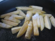 私はこんな作り方があるのか~って初めて知ったので、目からうろこでしたね~!!基本的に大学芋ってイモを揚げて、からめるタレを作るのが面倒だしタイミングなどが大変。だけどこの作り方はほんと簡単にできて、イモとサトウがあれば出来るので一度やってみたら普通のタレつくりなんてめったにしなくなっちゃうかも。:材料:さつまいも 1本 、サトウ 適量:作り方:さつまいもの皮をむいて、乱切りにして水につけてアクをとったら、水分をふき取る。170度に熱した油に、イモとサトウを入れてあげる。油の量は少なくても充分可能です。フタをしながら、イモをひっくりかえしながら適当な焦げ色になるまで揚げます。フタにつく水分はあけたときに入らないようにして、ふき取ってまた閉めるとカリっと仕上がります。つかったあとの油はサトウが残っているので処分してください。なので揚げ物の最後や、少量油で作ります。サトウが油の中で解けて、イモに絡んでくれます。お砂糖はイモにパラパラと振りかける感じですが、好みで加減してください。一度作りましたが、娘は大好物です。コドモなどが手でつまんで食べても大丈夫。タレ付きだと、トロっとしててクチの周りや手などを汚しそうですが、これは大丈夫。温度が高すぎると、糸引き状態になりますが、普通は、甘納豆についてるみたいな砂糖まぶしのサツマイモになるので、極力スナック感覚に近いです。もちろん、あのトロっとした正統派のタレが好きだという方もおられるかもですが、一度簡単なのでご存知ない方は試してみて比較してみてください。作る側は断然こっちのほうが嬉しいです
