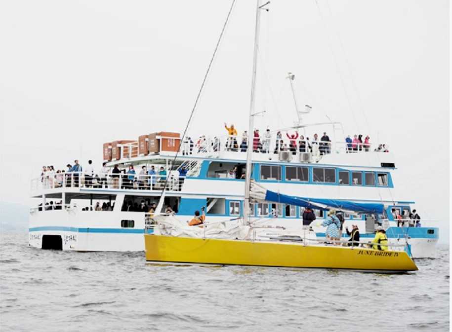 出場艇(手前)の乗組員と 手を振り合う 遊覧船の乗客たち。