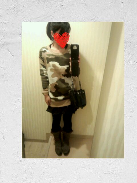 ご訪問ありがとうございます(^з^)-☆Chu!! 20130116coordinate☆ カモフラニット&ショーパン Rakuten ブーツ 貰い物バッグ ZARA 楽天さんの。 カモフラニットは頑丈。毛足が短いから毛玉しらず。スタッズは一個だけ子供に引っこ抜かれましたがσ(^_^; レザーショーパンはキュロットって感じでテカテカのレザーではなく控えめレザー。細身の方は大きめかも? ヘビロテアイテムです( ´艸`)