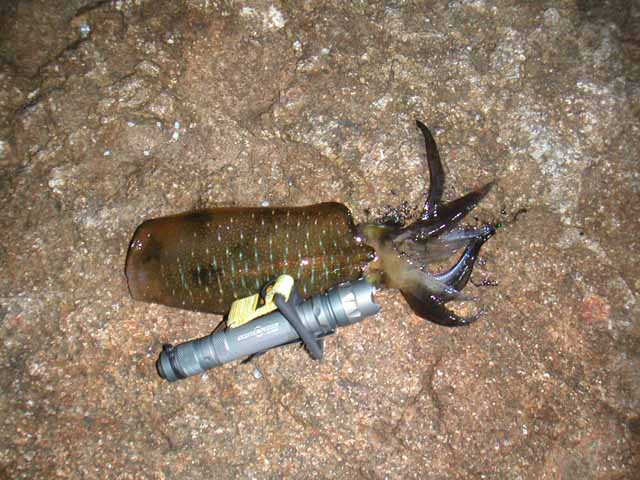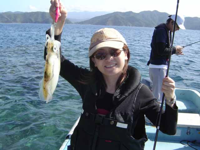 今回もヤマラッピさんの釣行にお邪魔して、とある場所まで行って来ました。先に現場入りしているヤマラッピさんたち。メールを頼りに夜の11:00頃到着しました。そこはけもの道のような斜面を下った所にある真っ暗な岩場。「えらいとこで釣ってんなぁ~」と思っていると「今釣れてますよぉ~」というタマちゃんの声。見ると袋の中にたくさんのイカちゃんたち!!ではさっそく、と恐る恐る岩場を歩きようやくキャスト。あれれ?ラインはどこだ?え?あんなとこ?流れ早っ!と暗闇の中を悪戦苦闘。ようやくメグゾーが400g位のを1杯釣り上げたのみ。ヤマラッピさんたちが大好きなうどんを食べに行かれたので、私たちは場所を移動する事に。静かで穏やかな海で釣れそうな雰囲気。。。が、1時間程で車に戻って寝ました。明日こそはタマちゃんを超えてやる! 翌日ヤマラッピさんたちと合流し、何箇所か漁港を回りました。が、いまだ1杯も釣れず。昨夜の岩場に行く事に。ヤマラッピさんたち、特にタマちゃんはどこでもだいたい釣れている様子。どの現場でも一番にキャストするのはタマちゃん。岩場もなんのそのでヒョイヒョイ移動、ヒョイっとイカちゃんを釣り上げる。こんな根性の入った女の子はなかなかいません。『打倒タマちゃん』で私も何杯かイカちゃんを釣り上げましたが完敗。。。 ヤマラッピさんたちは「名古屋へ手羽先食べに行く」との事なので、私たちは大阪へ向かって帰る事に。眠いしお腹すいたし、バーミヤンでちょっと休憩。そこにタマちゃんからメールが。「題名:画像見れます?」そこには。。。タマちゃんの顔よりでっかい頭が!ギョロっとでっかい目だまが!長~い足が!ハイ、画像見れました。ドーンとでっかいイカちゃんと笑顔のタマちゃんの2ショットでした。なんと1.5kg!!!スゴイです。スゴすぎです。タマちゃん改め『タマラッピ』! タマラッピからのメールの最後に「イツデモカカッテコイ」。。。