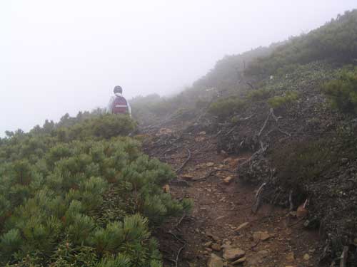 避難小屋からは,ひと登りで山頂のはず。天気は今イチですが,2人とも体調は悪くなく引き返す理由も見あたらないので,とりあえず山頂を目指すことにしました。 山頂を目指す長男 山頂までにカエルの卵を見つけたり,遭難碑を見つけたりでのんびりと登っていきます。そういえば,これまで前を登る人を全く見かけません。私たちが,一番はじめに登りだしたとは思えなかったのですが。子供が言うには,途中で先を行く人を見かけたとのことですが,私は確認できませんでした。そうこうしているうちに,急登はいつの間にか緩くなり,強風の吹きすさぶ山頂に到着しました。 山頂の標識 何も見えませんでしたが,ちょっと休んでいると時折太陽の形が見えてきて,薄日が差し込んできます。もしかしたら晴れるかも,と思って期待を寄せていたのですが,結局駄目でした。いつまでいてもしようがないので,10分ほどで下山にしました。 水たまりで見かけたカエルの卵 前手塩行きはあきらめて,元来た道を下山です。先ほどの避難小屋には,後から来たグループが休んでいました。でも,ここまで来ると霧が大分晴れてきて,周りの景色が見えるようになりました。 次第に姿を現した前手塩 前手塩の山頂が見えました。今頃登っていれば,展望が開けたかもしれませんが,仕方ありませんね。昔は山腹に山火事の後があったのですが,今はあまり目立ちません。 我々はこんなところを歩いていたのです 避難小屋を後にすると,ガスの中登ってきた道もうそのように開けてきて,やっと両目が開いた感じがしました。子供も下りながら,「家にいるよりもずっと楽しいな」と話してくれたので,こんな天候でも満足してくれてホッとしました。 シャクナゲの中を下山する長男 標高が下がるにつれて,暑くなってきて雨具を脱いだり生えていたタケノコをかじったりしながら,無事下山することができました。11時30分頃登山口に着き,帰りに愛別の協和温泉で汗を流してきました。 さようなら,また来ますね