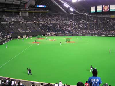今日は,朝から自転車で駅前まで行き,高速あさひかわ号で札幌へ向かいました。意外と一人で行動することに抵抗がある私ですが,こういった好きなことならそれほど感じません。札幌駅から地下鉄でドームへ。日ハムのTシャツやユニフォームを着た応援の人がたくさんいる中,一人特別な気分でドームに入りました。 もちろん,ビジター席。ドームの観客席から見るとほんの一握りの場所ですが,たくさんの応援の人が来ています。私も声を張り上げて応援しました。序盤は,勝てる雰囲気で大いに盛り上がったのですが,中盤からいつもの負ける予感が…。結局,最後のチャンスを生かすことができずに負けてしまいました。99%日ハム応援の中で,負けてしまうと本当に悔しいんですよね。でも,ホームへ行って応援できるはずもなく,いつもビジターの立場で応援しなければならないのが辛いところです。9時前に旭川の自宅に戻ってきたのですが,カミさんが子供と寝ていて鍵を開けてくれないという落ちまでつきました。またしても,私が行くと負けるというジンクスが守られました。これで1勝6敗ですよ。でも,今年はまだシーズンが終わっていないので,応援はさらに盛り上がりますよ!