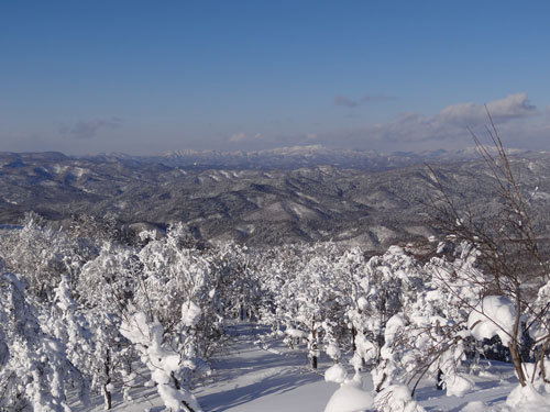 沢筋を登っていくと,さほど急斜面にもならずにどんどん高度を稼いでいくことができました。沢は雪崩の心配もありますが,ここはそれほどでもありません。やがて,782mピークとのコル近くになってきました。どこからか,スノーモービルの爆音も聞こえてきます。 山頂には,先行した登山者がいるようで,のんびり登っているわけにもいきません。少しペースを上げて登りますが,どうも膝の痛みが出てきたようです。運動不足な上に,今日のラッセルです。粉雪ではありましたが,予想以上に重く感じられてつらいラッセルだったのです。それでも,山頂までは何とか登ることができました。 山頂にいたのは,私よりも年上のおじさんでした。沢筋をずっと登ってきたそうです。ラッセルあとをお借りしたことにお礼を言いました。 山頂からの眺めは,まずまずです。遠くに見える白い山は糸魚岳のようです。ただ,残念なことに大雪山方面は雲がかかっていて見えませんでした。 それでも,久しぶりの好天に,来てよかったな~と思ってしまいました。先程のおじさんはすぐに下山していきましたが,私はここでパンを食べてしばし休憩。でも,のんびりしていると段々風が出て寒くなってきました。ゆっくりしていても良いのですが,そろそろ下山に取りかかります。 ところが,この下山が大変なことになりました。下り始めたすぐあとに,両足に激痛が!とうとう足がつってしまったのです。これは昨年のピヤシリ山以来のことです。こうなってしまったら,なかなか動くことが難しくなるのです。ただ立っていても痛くなるので,スキーを外して足を自由にしてあげるといくらか楽です。こうして,だましだましの下山となりました。 これは,もうスキーを楽しんでいる場合ではありません。何とか両足に負担をかけないで,立って滑っているしかないのです。おそらく登り返すことは無理でしょう。先行していったおじさんのあとを「登りはないはず」と信じて追っかけるしかありません。もはや足だけの力で自由に動かすことさえできなくなってきました。「もしかして,動けなくなったらそのまま遭難?」なんてことも頭をよぎりました。今回は無線機も持ってきているので,最後の手段はそれしかありません。ただ,時間的にはまだ明るいので,動けるうちは激痛に耐えながら下るだけです。 何度も転んだり,スキーを外して休んだりしながらようやく息のときに使った林道に到着しました。おじさんのおかげで,登りもなく無事に着いたのです。ここからは,ほんの数十分で何とか車までたどり着くことができました。 帰りに見た中愛別山です。それほど高い山ではありませんが,私にとっては装備・体力ともに課題となった山になりました。今度こそは,スキーを思う存分楽しみたい山にもなりました。