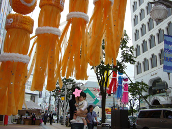 青森に行っている間に、幾つか夏祭りに行ってきました八戸の『七夕祭り』 (規模では仙台が有名ですが。。。)お祭り中は歩行者天国になって、歩けない程の人込みになるので、行ったのは、まだ準備中だけどね・・・お店ごとに通りいっぱいに飾りつけの最中でした。ネブタン、ひらひらキラキラに興味深々地元『八戸三社大祭』もお通り中は、ものすごい人なので、お通り前の移動だけ・・・・変わったカラフルな車(山車の一つ)が通るのを、お店の窓から見学してたよそして青森市の『ねぶた』「ネブタン」の名付け親であるhero君&ぺ天使ちゃん夫妻にご招待して頂きましたぺ天使ちゃんに浴衣を着せて頂いてすっかりお祭り気分しかもhero君、職場の飲み会に遅刻してまで、「ネブタンに一番良いねぶたを見せてあげる」と、『ねぶた』の一番の人気席を(割り込むおじさんおばさんに負けずに)ずっと並んで取ってくれました。 ありがと~おかげ様でママもネブタンも座って目の前で『ねぶた』を観覧ママは、『ねぶた』は跳ねたことはあったけど見るのは初めて迫力があってとても綺麗でした飲み会の終わった荷物持ち係のhero君に抱っこされ、眠々ネブタンは、夢の中へパパは奈良で「ネブタンに先越されたよ~」だってネブタンが大きくなったら『ねぶた』一緒に跳ねたいな